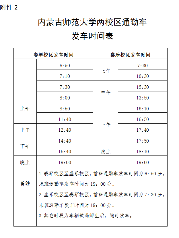 2.两校区发车时间: 赛罕校区早始发车时间为6:50;末班车发车时间为19:00。 盛乐校区早始发车时间为7:30;末班车发车时间为19:00。其他通勤车发车时间安排详见附件2:内蒙古师范大学两校区通勤车发车时间表。