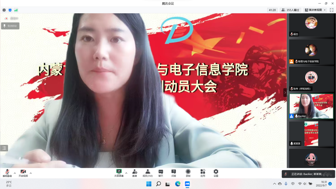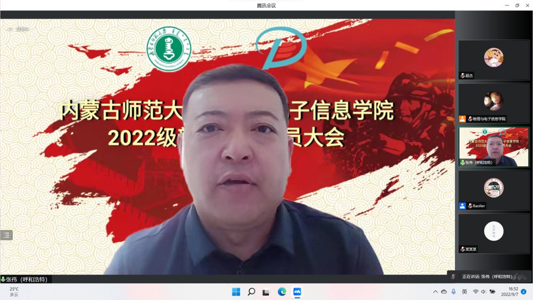 2022级新生军训动员大会于线上成功举办。学院党委副书记、副院长张伟、学就办副主任王乐、团总支副书记宝力尔、辅导员吴亚楠出席会。会议由学院团总支副书记宝力尔老师主持,2022级全体本科生参加。