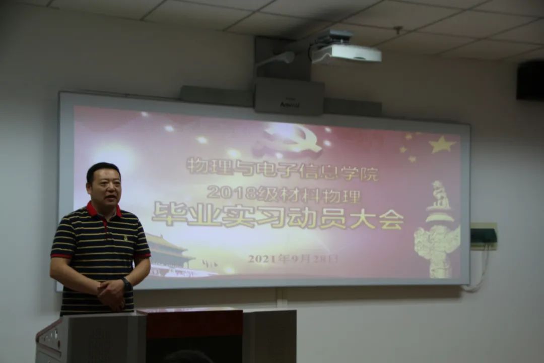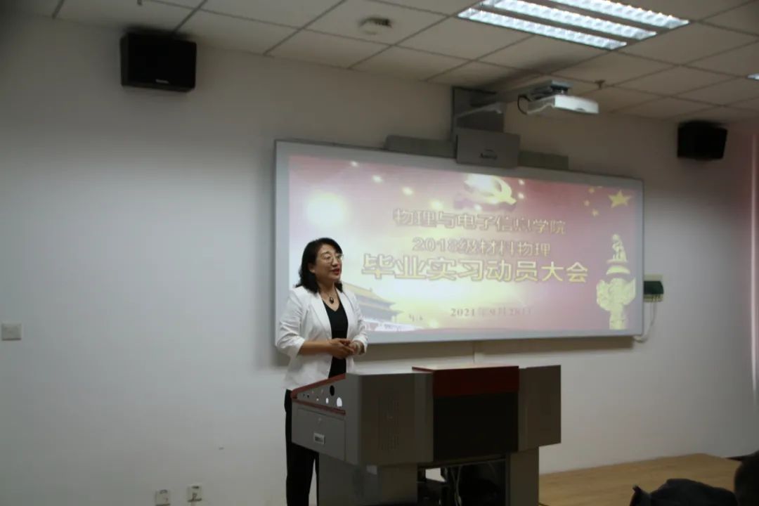 于理工楼A0301学术报告厅召开2018级材料物理专业毕业实习动员大会,党委书记刘美玲,院长曹永军,党委副书记兼副院长张伟,副院长那日苏出席本次会议,2018级材料物理专业全体学生参会。本次会议由材料系副主任包黎红主持。